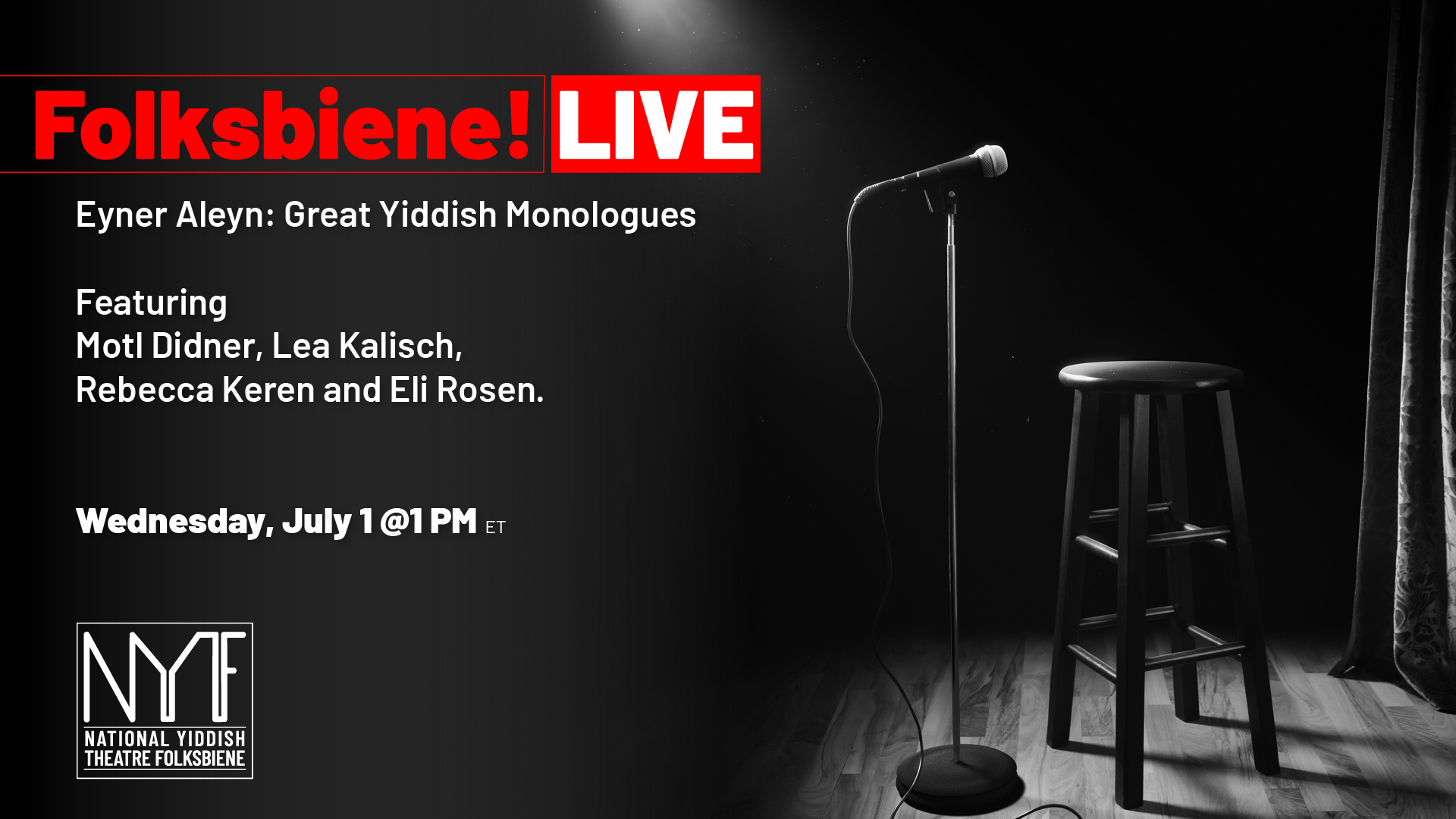 An evening of great monologues from the Yiddish stage featuring Motl Didner, Lea Kalisch, Rebecca Keren, and Eli Rosen.